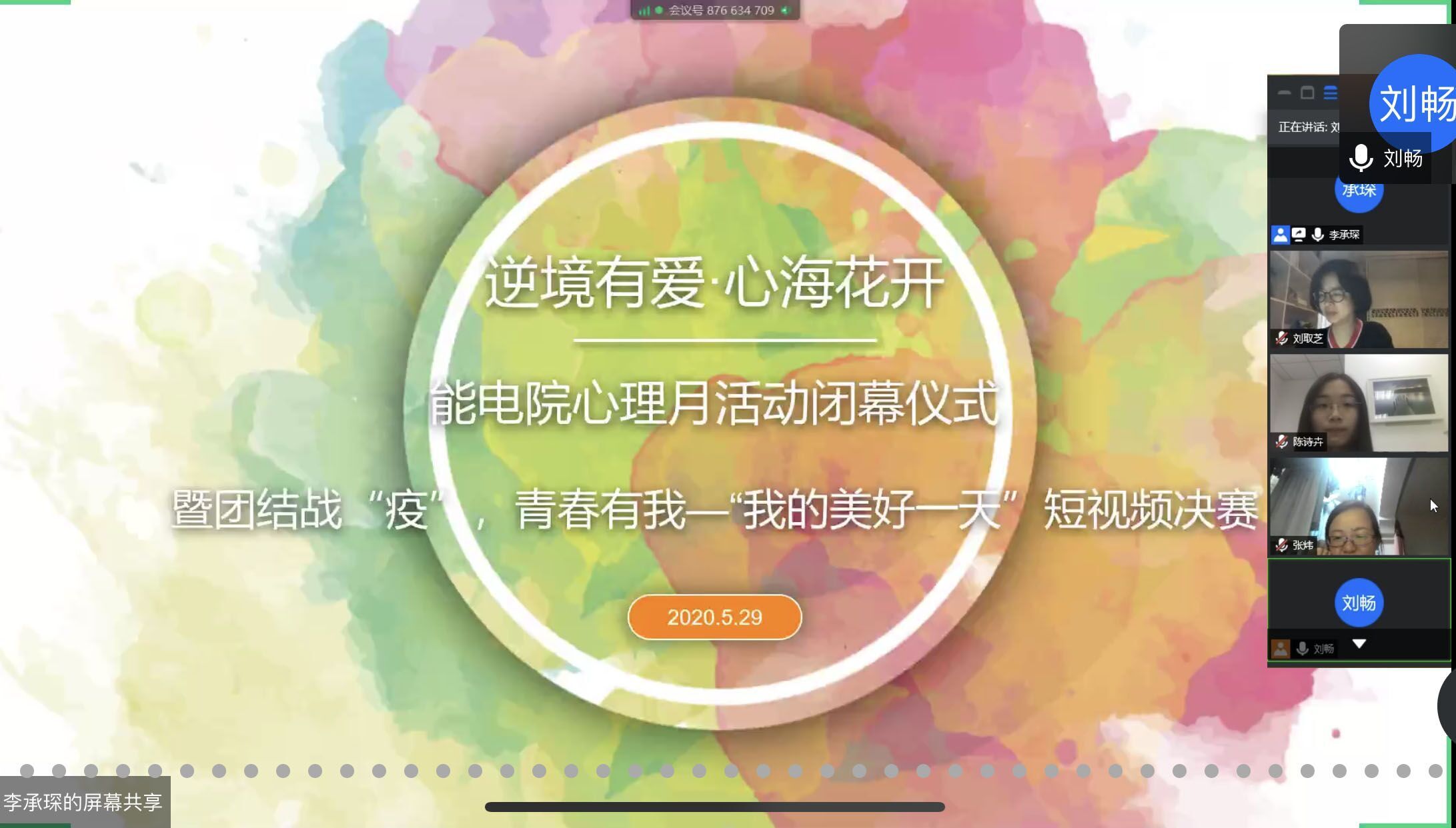 5月29日晚,能电院心理活动月“团结战’疫’,青春有我—我的美好一天”短视频大赛在网络平台顺利举办,大赢家比分 心理健康教育月活动落下帷幕。短视频大赛邀请到了大赢家比分 心理健康教育与研究中心主任刘取芝、专职心理老师陈诗卉作为专业评委,大赢家比分 党委副书记张炜出席并总结寄语。含少数民族生在内的12名参赛选手轮流展示个人作品,同时在线观看人数达到近200人。
