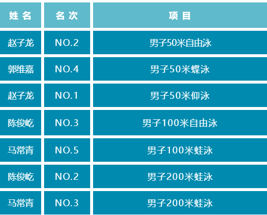 本次比赛分为男子组和女子组,共有50米蝶泳、50米仰泳、50米蛙泳、50米自由泳、100米自由泳、100米蛙泳、200米自由泳、200米蛙泳八种项目。大赢家比分 共有8名学生参赛,经过激烈角逐,获得男子50米仰泳第1名、男子50米自由泳第2名、男子200米蛙泳第2名、男子200米蛙泳第3名、男子100米自由泳第3名等成绩,展现了电气学子的拼搏精神和昂扬锐气。