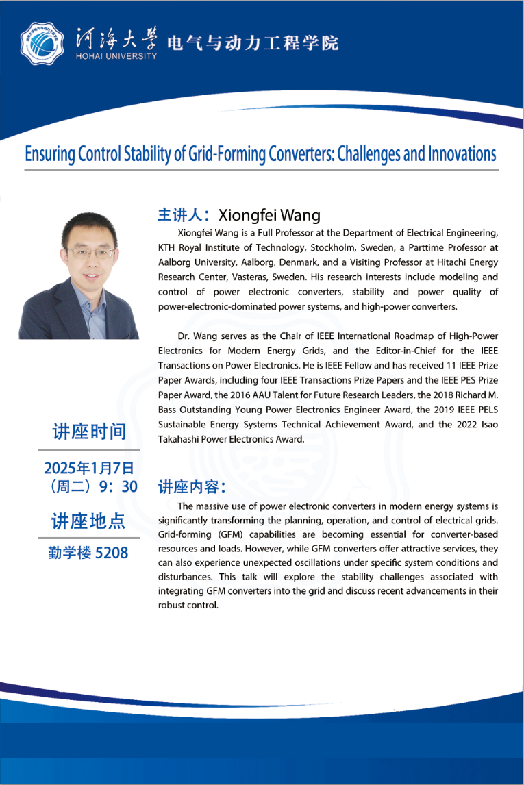 学术报告:Ensuring Control Stability of Grid-Forming Converters: Challenges and Innovations