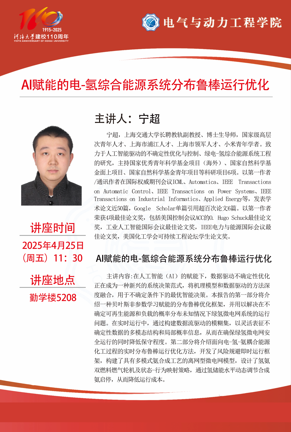 学术报告: AI赋能的电—氢综合能源系统分布鲁棒运行优化