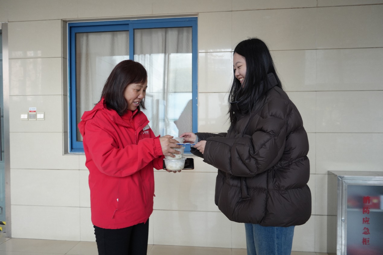 随后,送温暖队伍来到校医室。寒假期间,校医室依然保持值班,为留校师生的健康保驾护航。“真的没想到,太贴心了!”值班的医生接过饺子时笑容满面,“我们会继续守好岗位,为大家的健康服务。”